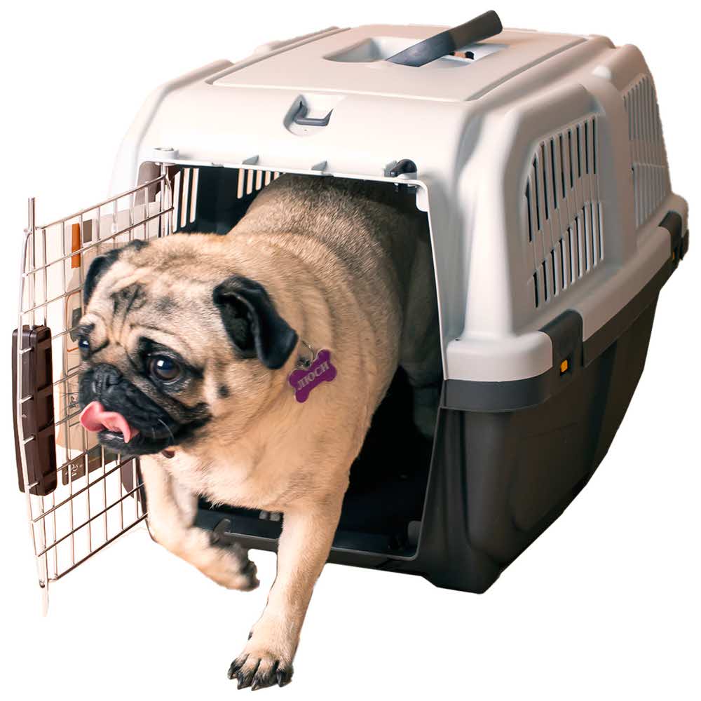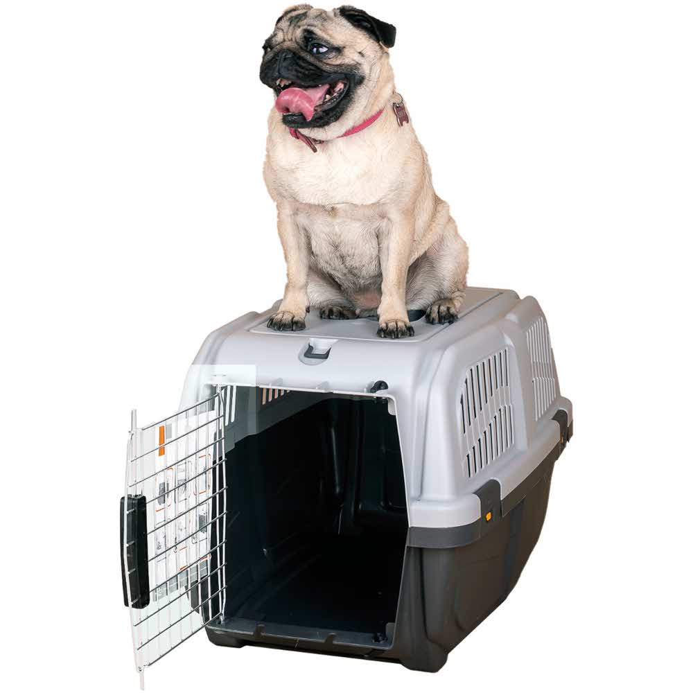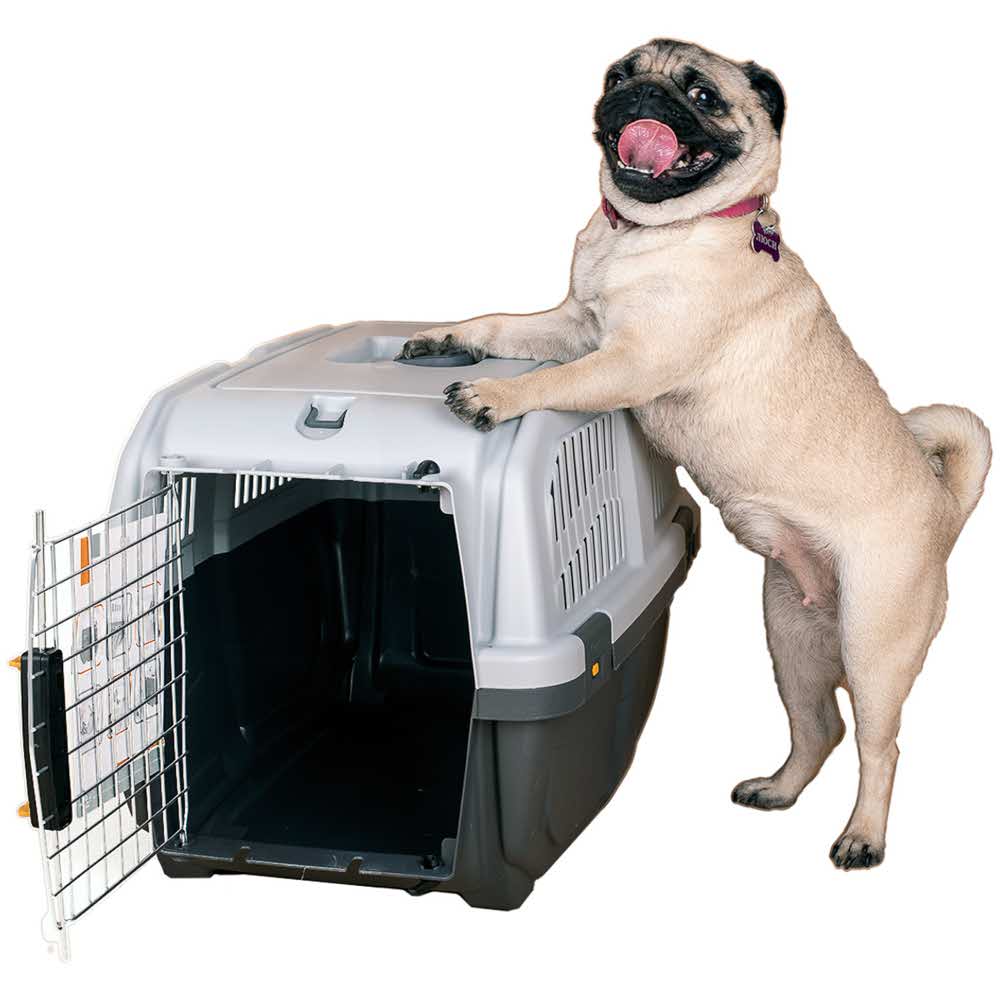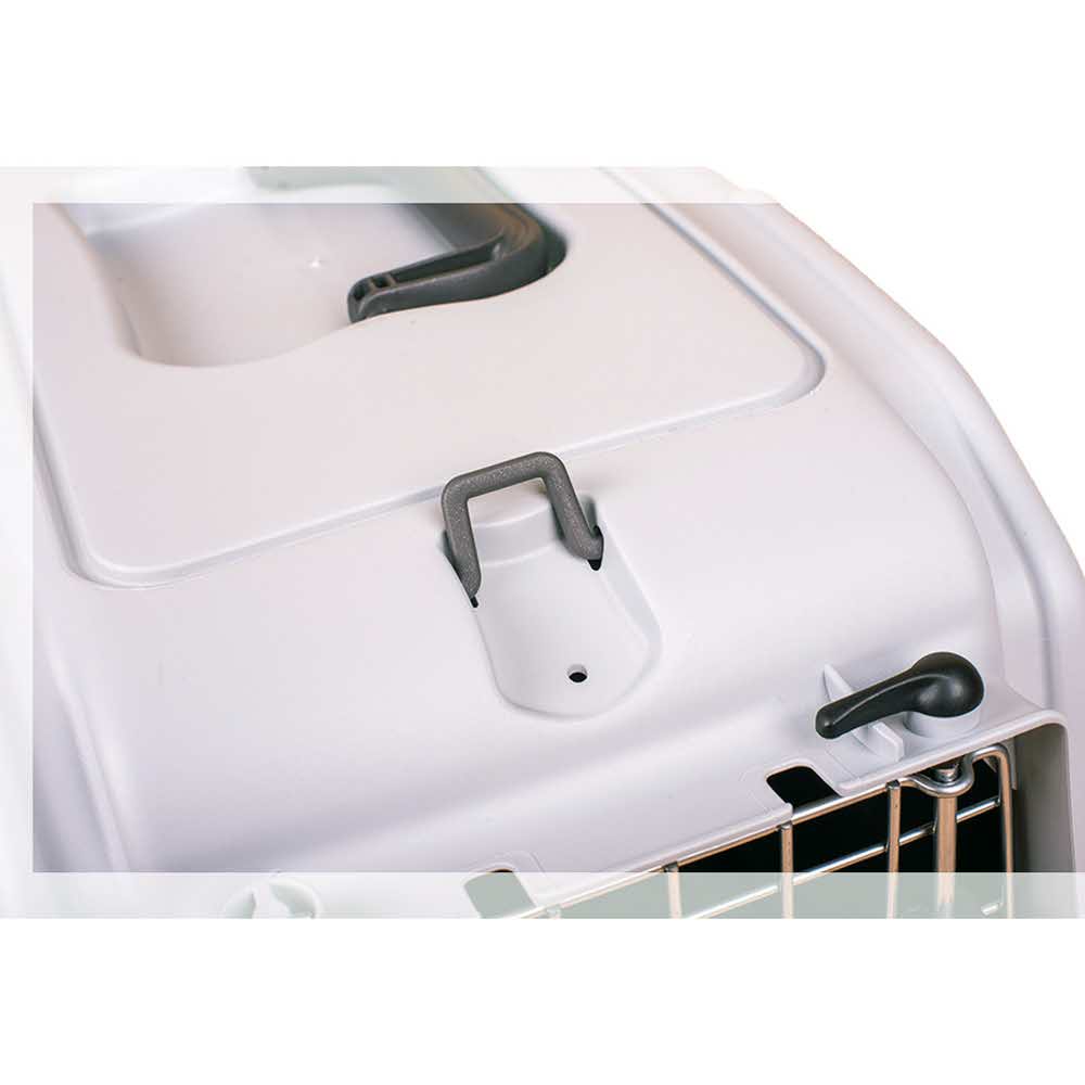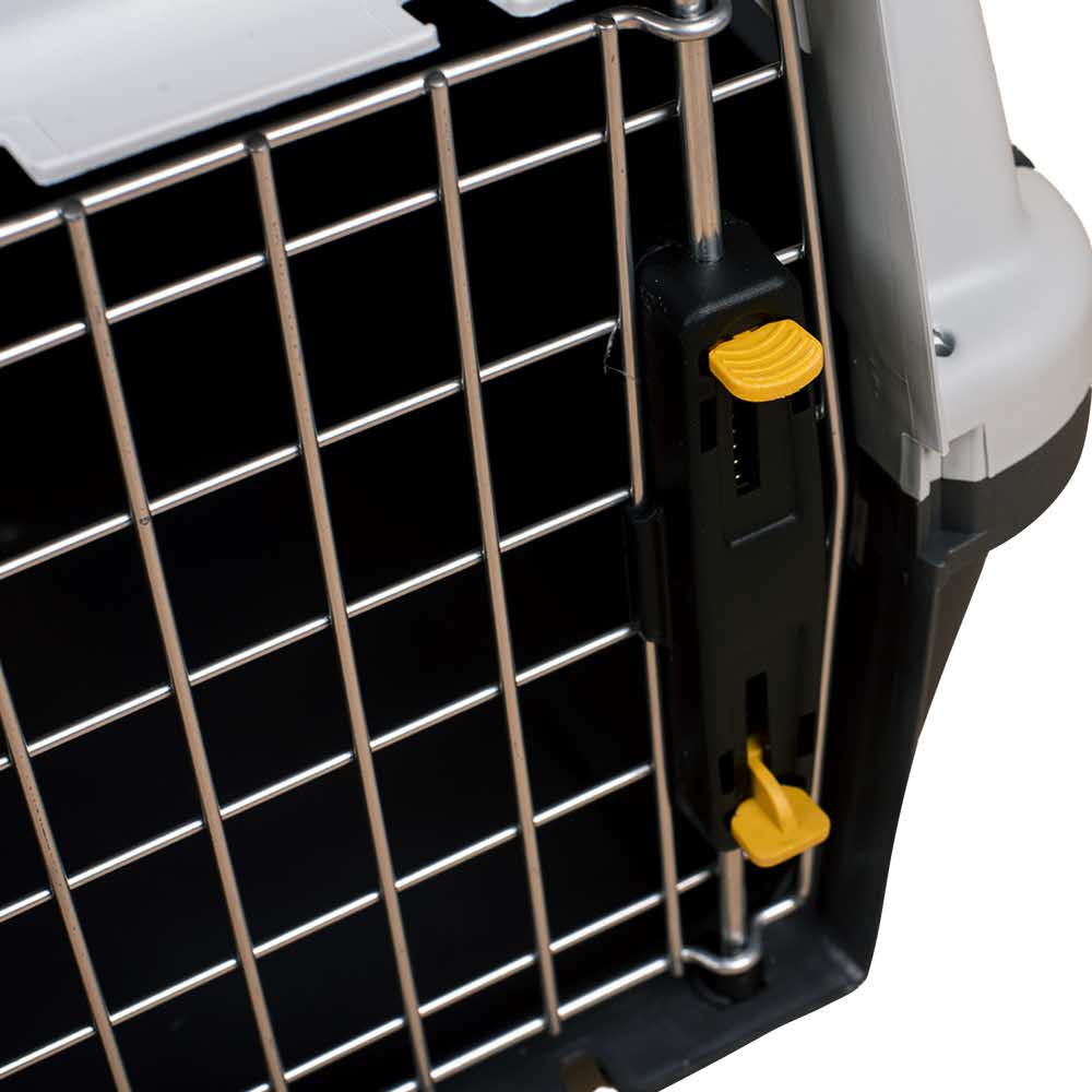 Оснащенная металлической дверцей, которая запирается сверху и снизу и имеет дополнительные поворотные фиксаторы, переноска обеспечивает безопасность питомцев во время путешествий.