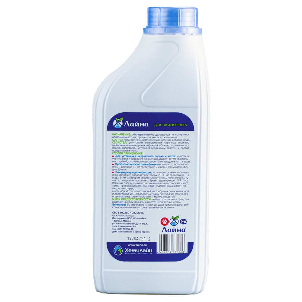 Лайна для животных с ароматом лаванды является профессиональным дезинфицирующим средством, предназначенным для дезинфекции и уборки помещений, где содержатся домашние животные. Лайна обладает широким спектром антимикробного действия в отношении возбудителей инфекционных болезней бактериальной, вирусной и грибковой этиологии, отличными моющими и дезодорирующими свойствами, при проведении генеральных уборок удаляет метки животных и жировые загрязнения, устраняет неприятные запахи. Дезинфекция может быть совмещена с мойкой и дезодорацией в одном процессе.