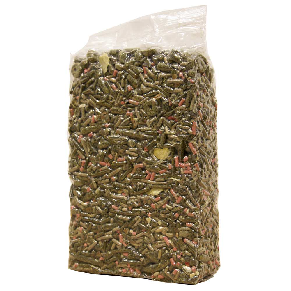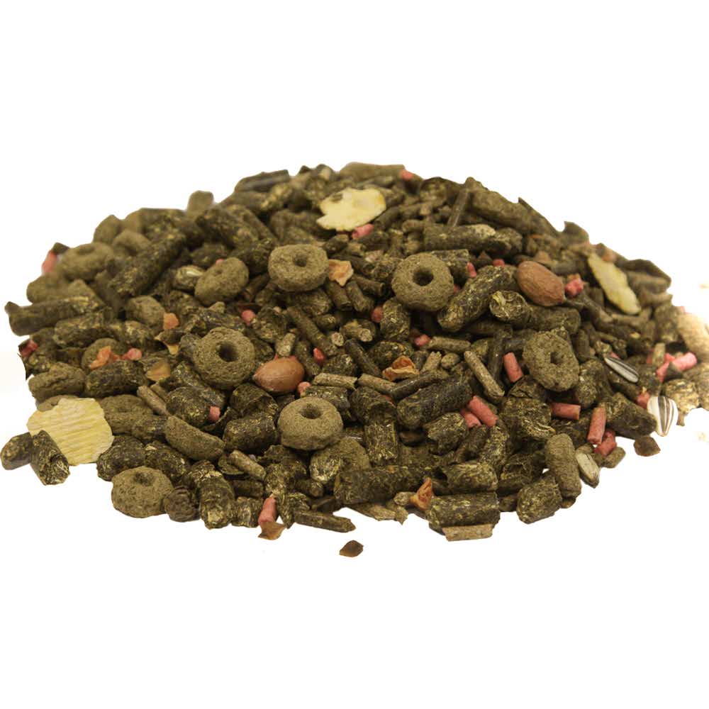 Экструдированная люцерна, гранулированные продукты (фураж и отруби и производные продукты, крупа, сухой порошок, семена масличной культуры и фруктовые масла, минералы и производные продукты, ароматизаторы и консерванты одобренные ЕC 0,1%), кольца (зерна и зерновые продукты, экструдированная люцерна, фураж и отруби и производные продукты 1%), чистый гранулированный продукт (зерна и зерновые продукты, дрожжи, сыворотка, минералы и производные продукты, растительные масла и жиры), гранулированные красные продукты (мука, зерна и зерновые продукты, мед, масло и жиры, экстракт юкки Шидигера, красители и консерванты одобренные EC), сушеная морковь, семена подсолнечника, семена гречихи, измельченный горох, ананас, неочищенный арахис. |