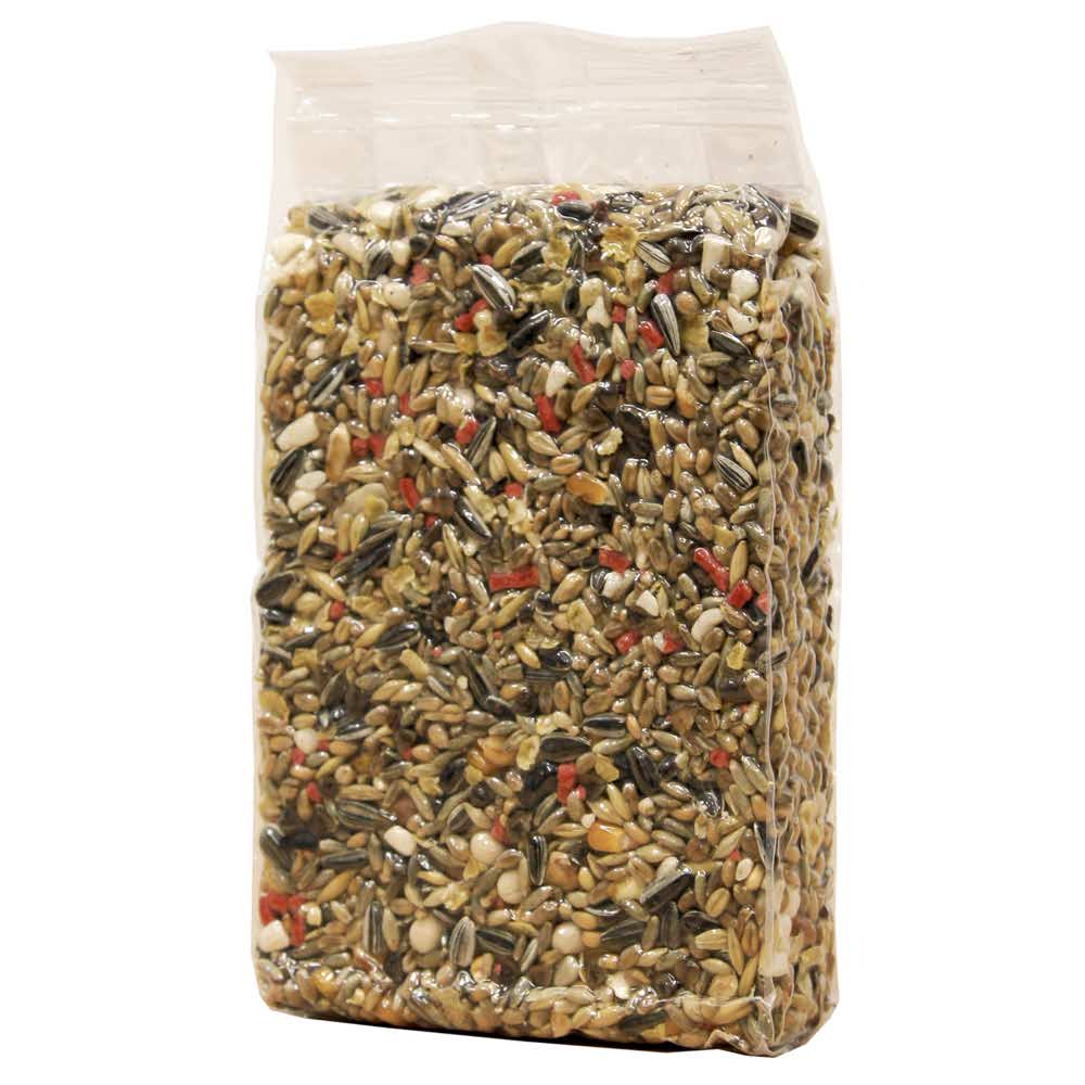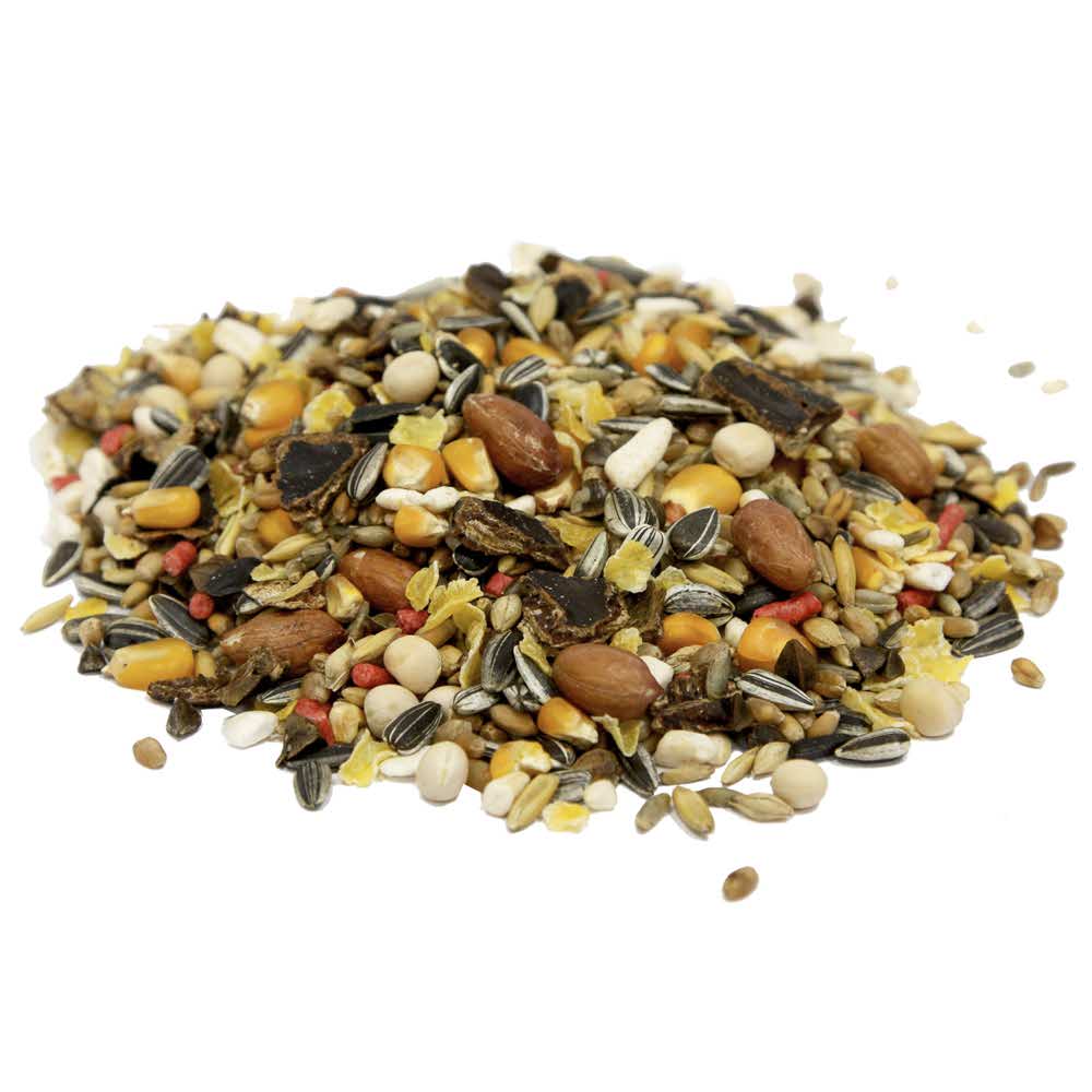 Ингредиенты: пшеница, кукуруза цельная, рожь очищенная, горох очищенный, подсолнечник полосатый 5%, арахис очищенный 5%, плоды рожкового дерева 5%, овес неочищенный, гречиха, кукурузные хлопья, красные гранулы (пекарные продукты, злаки и зерновые продукты, мед 10%, масла, экстракт Юкки Schidigera, красители и консерванты, одобренные ЕС) 4,1%, ячмень неочищенный, рис воздушный. |