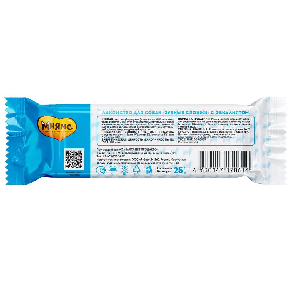 Мнямс DENTAL "Зубные спонжи" с эвкалиптом – вкусное и полезное лакомство для взрослых собак и щенков старше 3-х месяцев. Благодаря специальной форме и структуре, спонжи позволяют эффективно и бережно очистить и отполировать зубную эмаль без применения зубной пасты, предотвращают появление зубного налета и камня. Благодаря эвкалипту в составе, способствуют снижению кровоточивости десен, дезодорирует полость рта и освежают дыхание.
