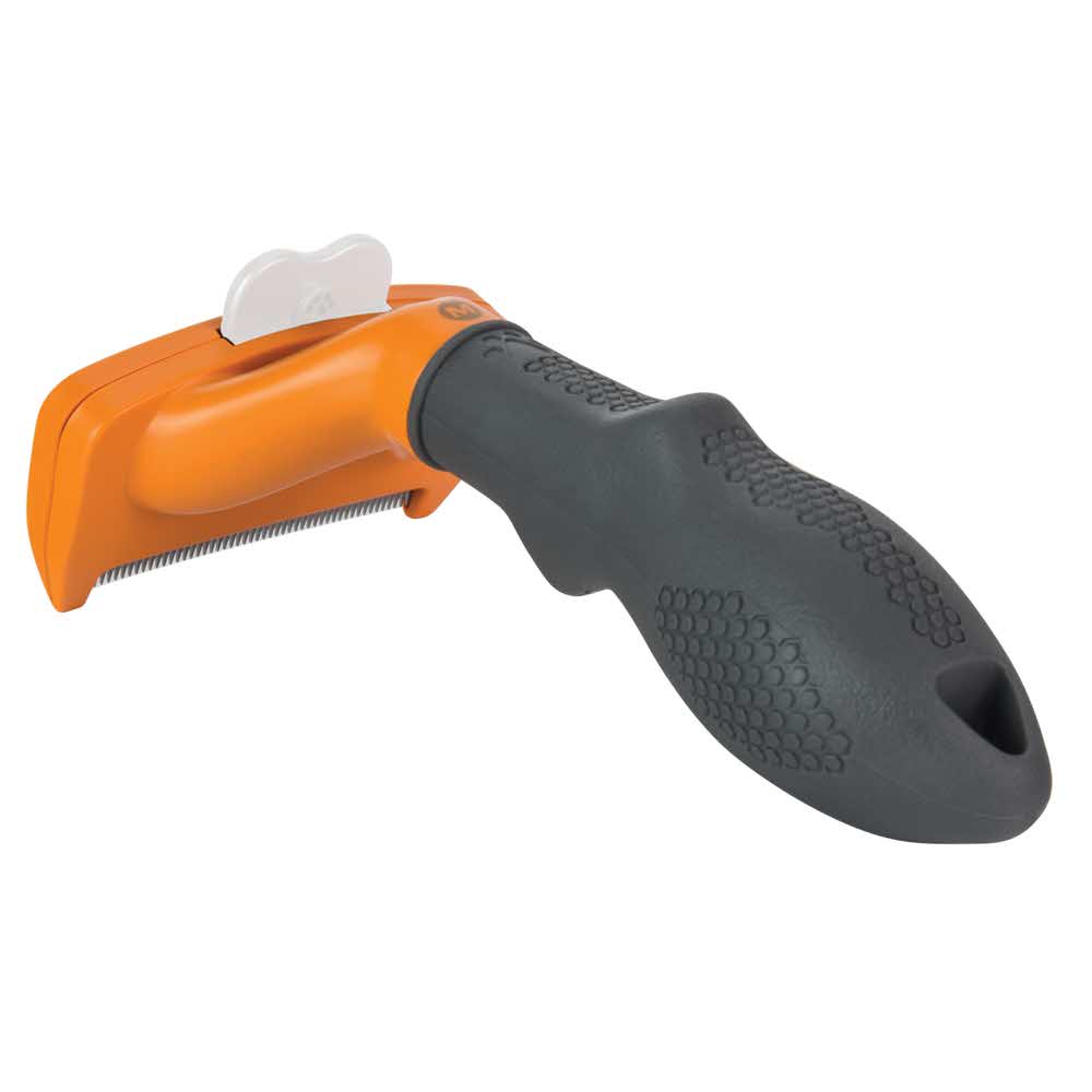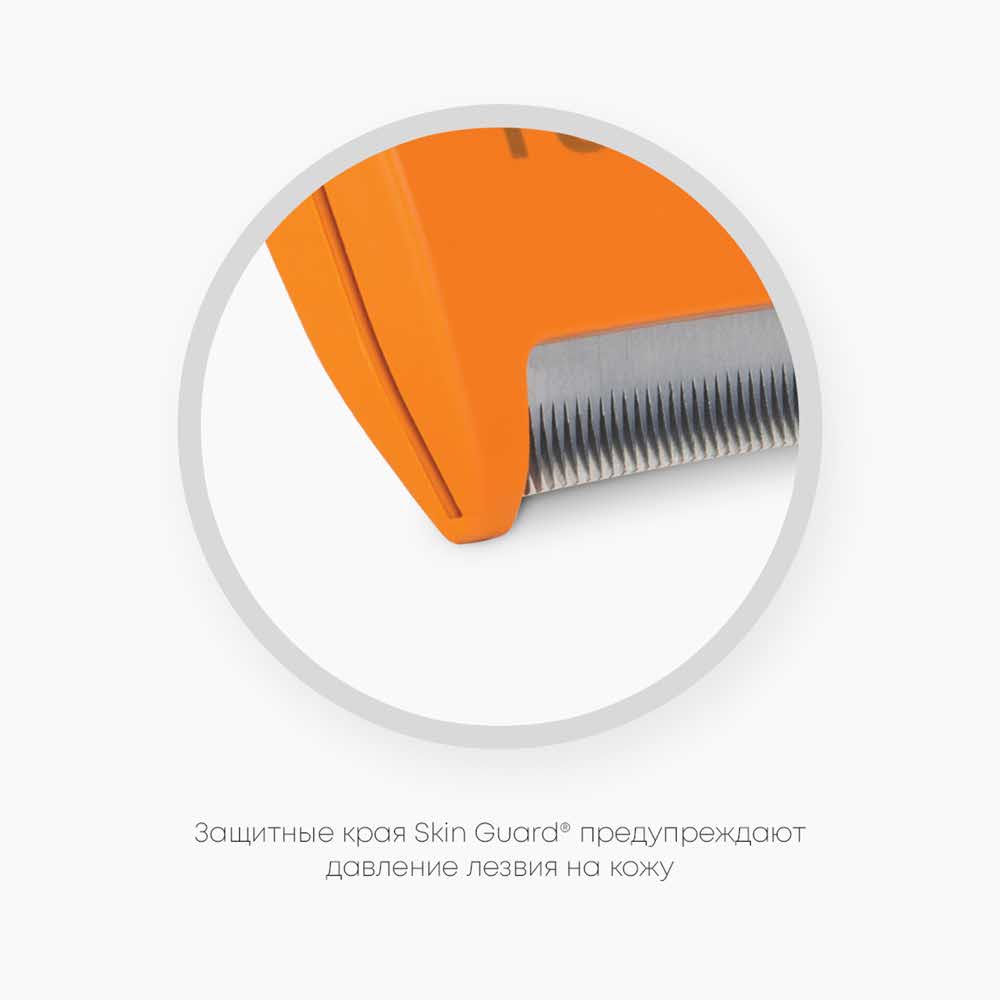 Кнопка самоочистки легко сбрасывает шерсть с инструмента. Защелкните ее для защиты в процессе хранения. Защитные края предупреждают давление на кожу.