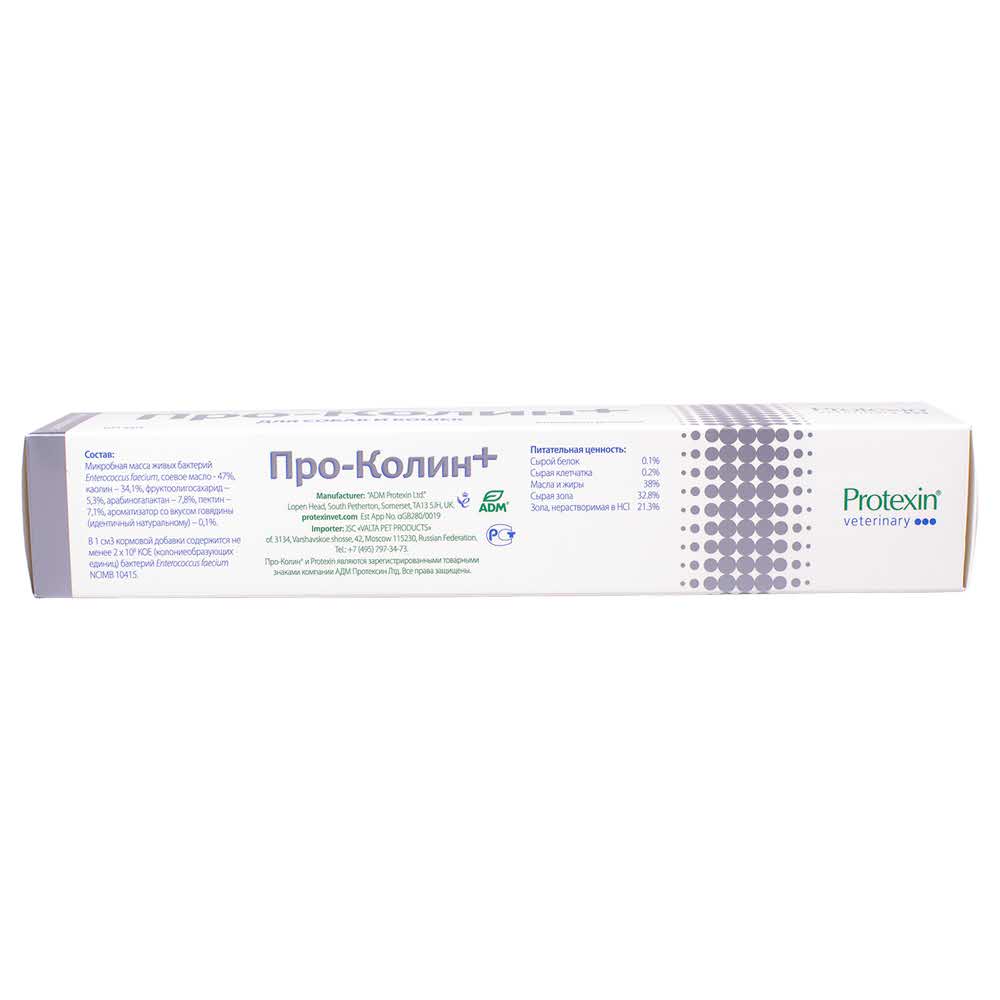 Кормовая добавка состоит из микробной массы бактерий Enterococcus faecium, соевого масла, каолина, фруктоолигосахарида, арабиногалактана, пектина, ароматизатора со вкусом говядины. В 1 см3 кормовой добавки содержится не менее 2х108 КОЕ бактерий Enterococcus faecium NCIMB 10415. По внешнему виду Про-Колин+® представляет собой гомогенную пасту светло-коричневого цвета. Выпускают расфасованными по 15, 30 и 60 мл в калиброванные пластиковые тубусы с дозатором, упакованные в картонную коробку поштучно. |
