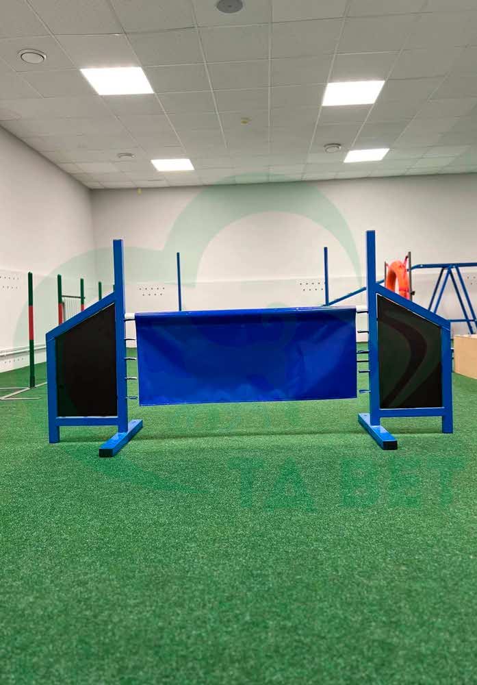 - Барьер комплектуется одной планкой, размером 1,2м. Планка изготовлена из пластиковой трубы белого цвета; обтянута ПВХ полотном в пол, для невозможности преодоления препятствия собакой под планкой.