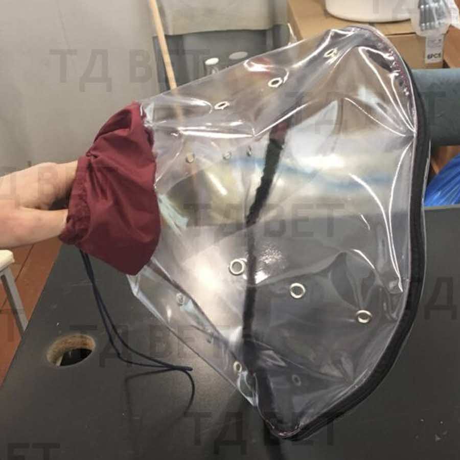Легко надевается и снимается (горло на "липучке"). Передняя стенка полностью открывается при помощи молнии, животное можно погладить и успокоить.