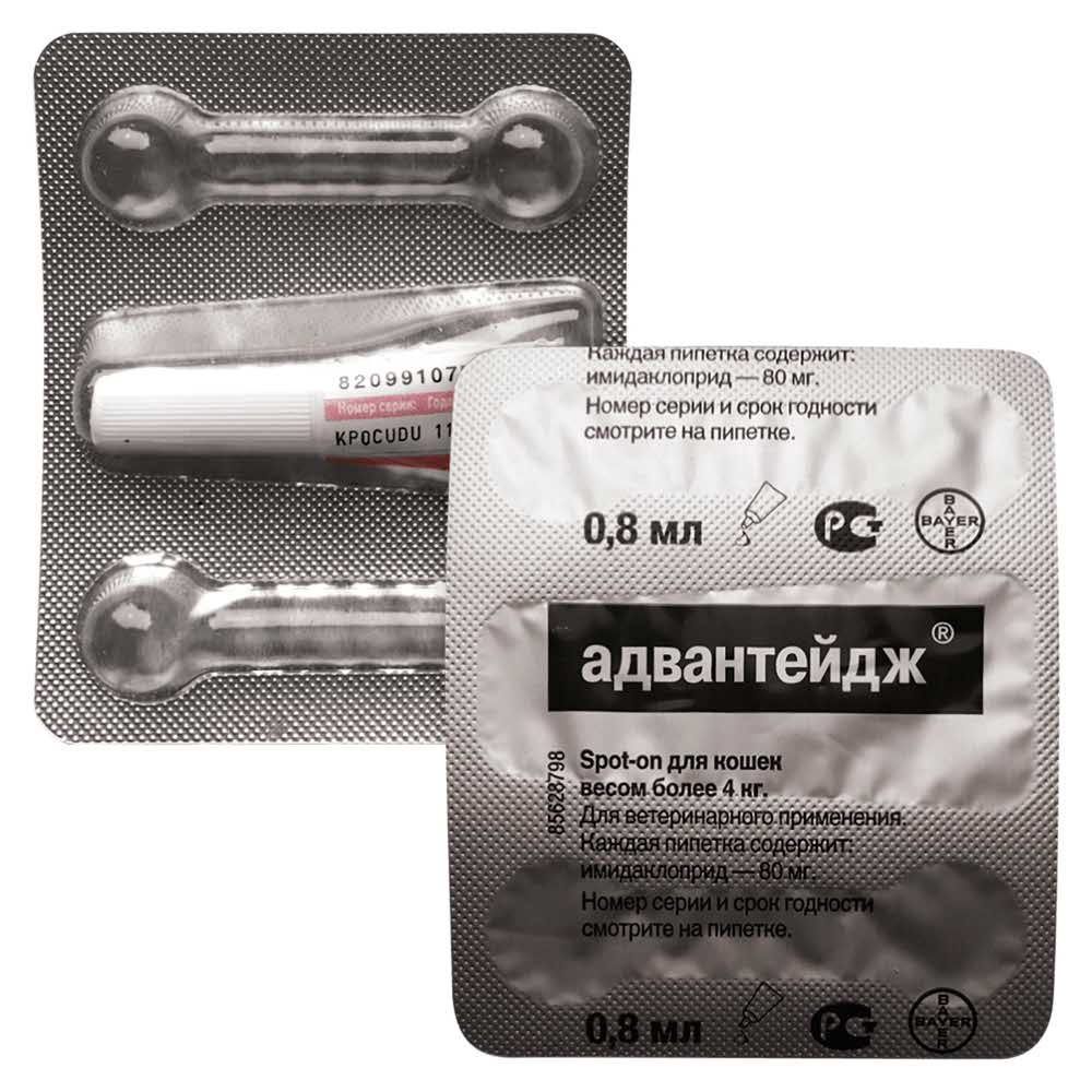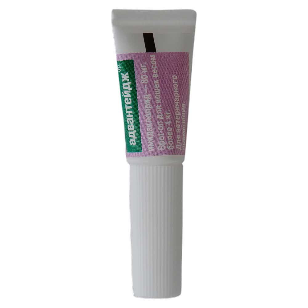Адвантейдж 80 капли для кошек больше 4 кг от блох (1 пипетка х 0,8 мл) - продукт, помогающий защитить кошку от блох, вшей и власоедов. Также разрешено использовать декоративным кроликам. Капли Адвантейдж распределяются по шерсти и коже и избавляют животное от блох, а также препятствуют повторному заражению блохами в течение 28 дней после применения препарата.