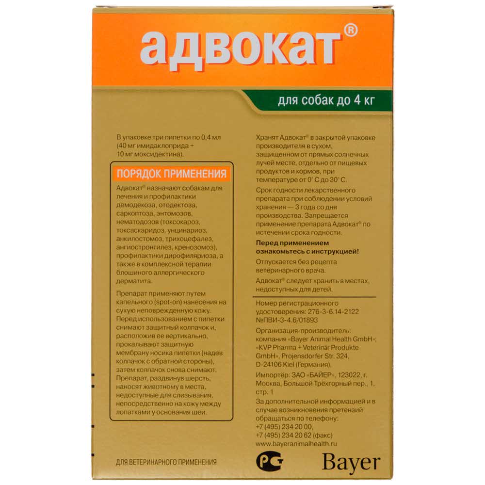 Лекарственное средство в форме раствора для наружного применения содержит в 1 мл в качестве действующего вещества имидаклоприд - 100 мг и моксидектин - 25 мг, а также вспомогательные компоненты: спирт бензиловый 807,3 мг, пропилен карбонат 165,0 мг, бутилгидрокситолуен 1 мг. По внешнему виду препарат представляет собой прозрачный раствор от желтого до коричневого цвета. Расфасовывают по 0,4 мл в пропиленовые пипетки соответствующей вместимости. Упаковывают по 3 пипетки в блистеры из алюминиевой фольги, которые вкладывают в картонные коробки. Адвокат применяют животным путем капельного («spot-on») нанесения на сухую неповрежденную кожу. Перед использованием с пипетки снимают защитный колпачок и, расположив ее вертикально, прокалывают защитную мембрану носика пипетки (надев колпачок с обратной стороны), затем колпачок снова снимают. Препарат, раздвинув шерсть, наносят животному в места, недоступные для слизывания, непосредственно на кожу между лопатками у основания шеи. При обработке крупных животных содержимое пипетки наносят на кожу в 3 – 4 места. Минимальная терапевтическая доза препарата для собак составляет 0,1 мл/кг массы тела животного (10 мг/кг имидаклоприда и 2,5 мг/кг моксидектина).