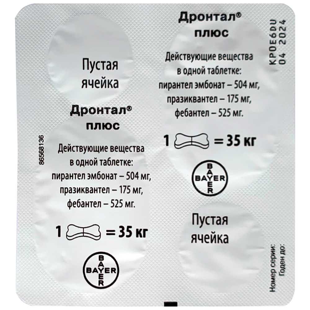 Таблетка в форме косточки от светло-коричневого до темно-коричневого цвета с разделительной бороздкой по центру. В 1 таблетке, рассчитанной на 35 кг массы животного: пирантел эмбонат - 504 мг, празиквантел - 175 мг и фебантел - 525 мг, а также вспомогательные вещества: лактозы моногидрат, микрокристаллическую целлюлозу, крахмал кукурузный, поливидон, магния стеарат, натрия лаурилсульфат, кроскармеллозу натрия, кремний коллоидный безводный, пищевую добавку со вкусом мяса. Таблетки Дронтал XL плюс фасуют в блистеры по 2 таблетки, которые упаковывают в картонные пачки вместе с инструкцией по применению. |