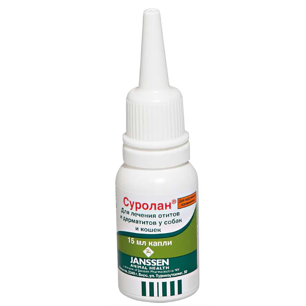 Elanco Суролан 15 мл - препарат, помогающий решить проблему наружного отита и заболеваний кожи, вызванных бактериями и грибами, у кошек и собак.