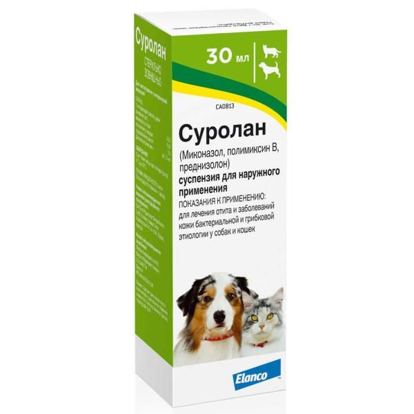 Суролан применяют собакам и кошкам в качестве ушных капель для лечения острого и хронического наружного отита (воспаления наружного слухового прохода), а также для лечения заболеваний кожи (дерматитов, пиодерматитов, дерматофитозов, инфицированных ран, абсцессов) бактериальной и грибковой этиологии.
