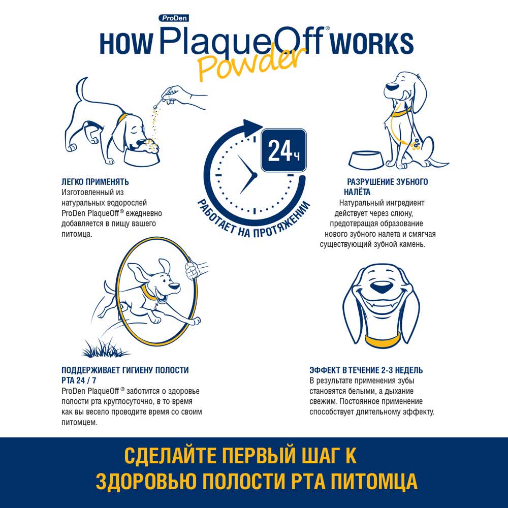 Постоянное использование ProDen PlaqueOff® Powder профилактирует образование зубного налета, камня и неприятного запаха изо рта у собак и кошек.