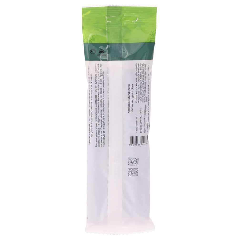 Золотая коллекция – это линейка лучших лакомств TITBIT, разработанных при участии владельцев домашних животных и их питомцев. Колбаски «Миланские» это сыровяленые колбаски из баранины с добавлением говяжьего сердца. Эта колбаса станет прекрасным угощением для вашего питомца. Вкусовая палитра дополнена нотами кориандра и орегано, на срезе видны молотые кусочки говяжьей шкуры.