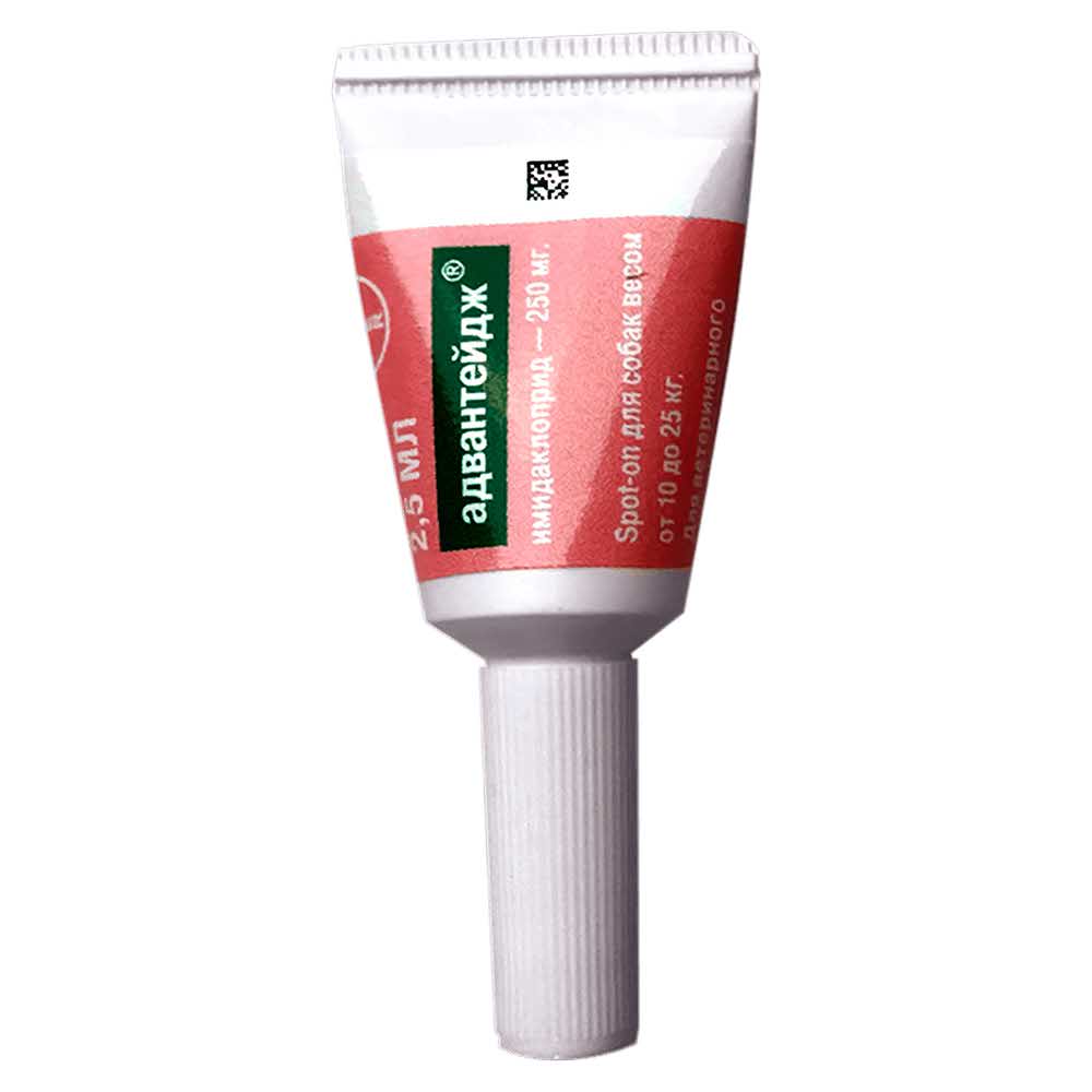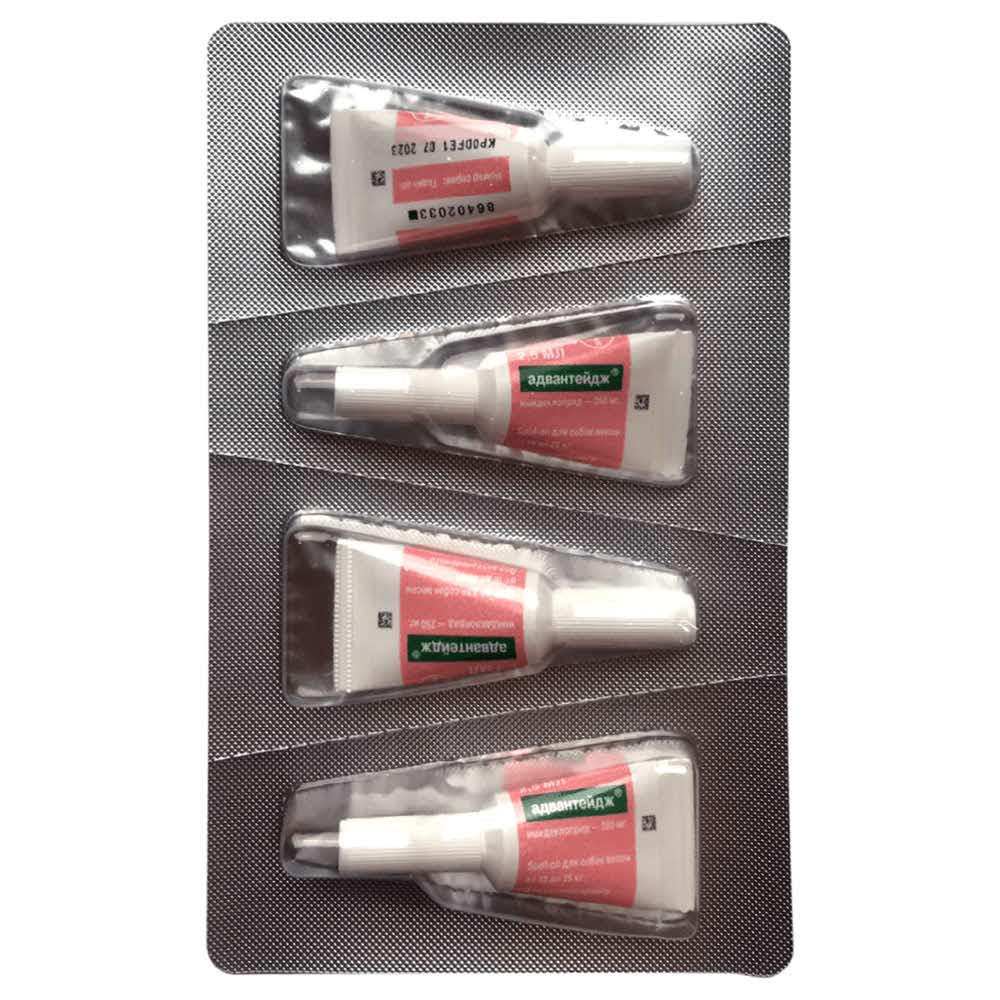 Адвантейдж 250 капли для собак 10-25 кг от блох (4 пипетки х 2,5 мл) - продукт, помогающий защитить собаку от блох, вшей и власоедов. Капли Адвантейдж распределяются по шерсти и коже и избавляют животное от блох, а также препятствуют повторному заражению блохами в течение 28 дней после применения препарата.