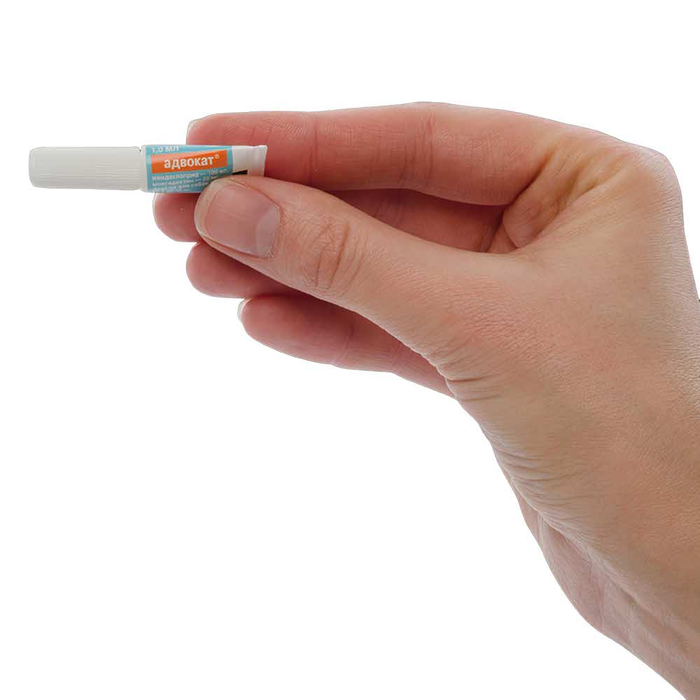 Адвокат применяют животным путем капельного («spot-on») нанесения на сухую неповрежденную кожу. Перед использованием с пипетки снимают защитный колпачок и, расположив ее вертикально, прокалывают защитную мембрану носика пипетки (надев колпачок с обратной стороны), затем колпачок снова снимают. Препарат, раздвинув шерсть, наносят животному в места, недоступные для слизывания, непосредственно на кожу между лопатками у основания шеи. При обработке крупных животных содержимое пипетки наносят на кожу в 3 – 4 места. Минимальная терапевтическая доза препарата для собак составляет 0,1 мл/кг массы тела животного (10 мг/кг имидаклоприда и 2,5 мг/кг моксидектина).