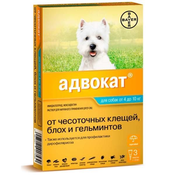 Адвокат 100 капли на холку для собак 4-10 кг (3 пипетки х 1 мл) от чесоточных клещей, блох и гельминтов назначают собакам весом от 4 до 10 кг для лечения и профилактики демодекоза, отодектоза, саркоптоза, энтомозов, кишечных нематодозов (токсокароз, токсаскаридоз, унцинариоз, анкилостомоз), а также для лечения и профилактики дирофиляриоза.