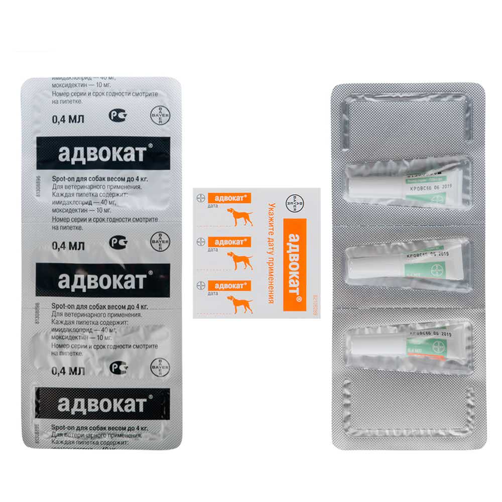 Лекарственное средство в форме раствора для наружного применения содержит в 1 мл в качестве действующего вещества имидаклоприд - 100 мг и моксидектин - 25 мг, а также вспомогательные компоненты: спирт бензиловый 807,3 мг, пропилен карбонат 165,0 мг, бутилгидрокситолуен 1 мг. По внешнему виду препарат представляет собой прозрачный раствор от желтого до коричневого цвета. Расфасовывают по 0,4 мл в пропиленовые пипетки соответствующей вместимости. Упаковывают по 3 пипетки в блистеры из алюминиевой фольги, которые вкладывают в картонные коробки. Адвокат применяют животным путем капельного («spot-on») нанесения на сухую неповрежденную кожу. Перед использованием с пипетки снимают защитный колпачок и, расположив ее вертикально, прокалывают защитную мембрану носика пипетки (надев колпачок с обратной стороны), затем колпачок снова снимают. Препарат, раздвинув шерсть, наносят животному в места, недоступные для слизывания, непосредственно на кожу между лопатками у основания шеи. При обработке крупных животных содержимое пипетки наносят на кожу в 3 – 4 места. Минимальная терапевтическая доза препарата для собак составляет 0,1 мл/кг массы тела животного (10 мг/кг имидаклоприда и 2,5 мг/кг моксидектина).